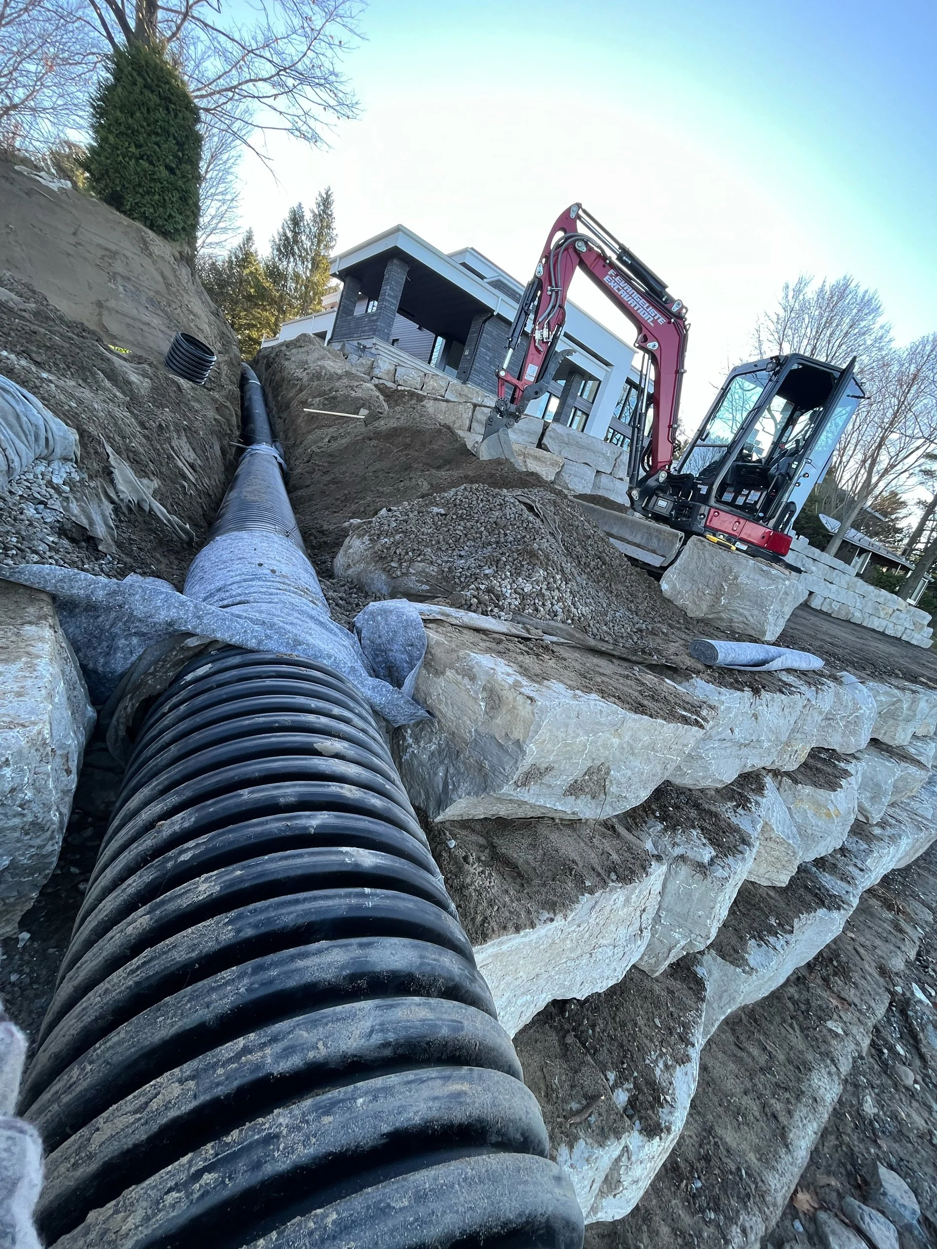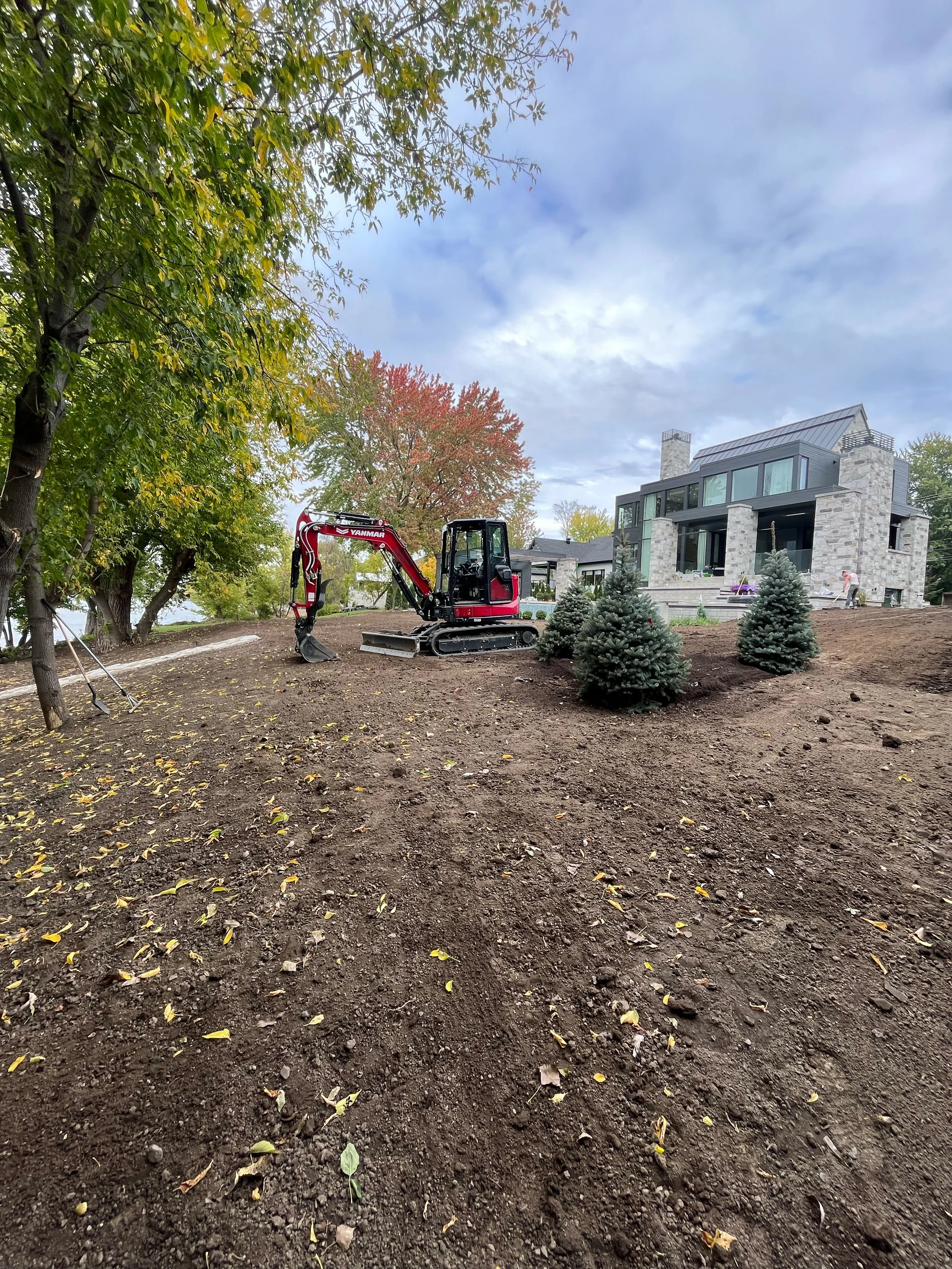 Excavation pour terrassement, nivellement au laser, préparation de terrain, paysagement et installation de murs de soutènement, ainsi que travaux de démolition.