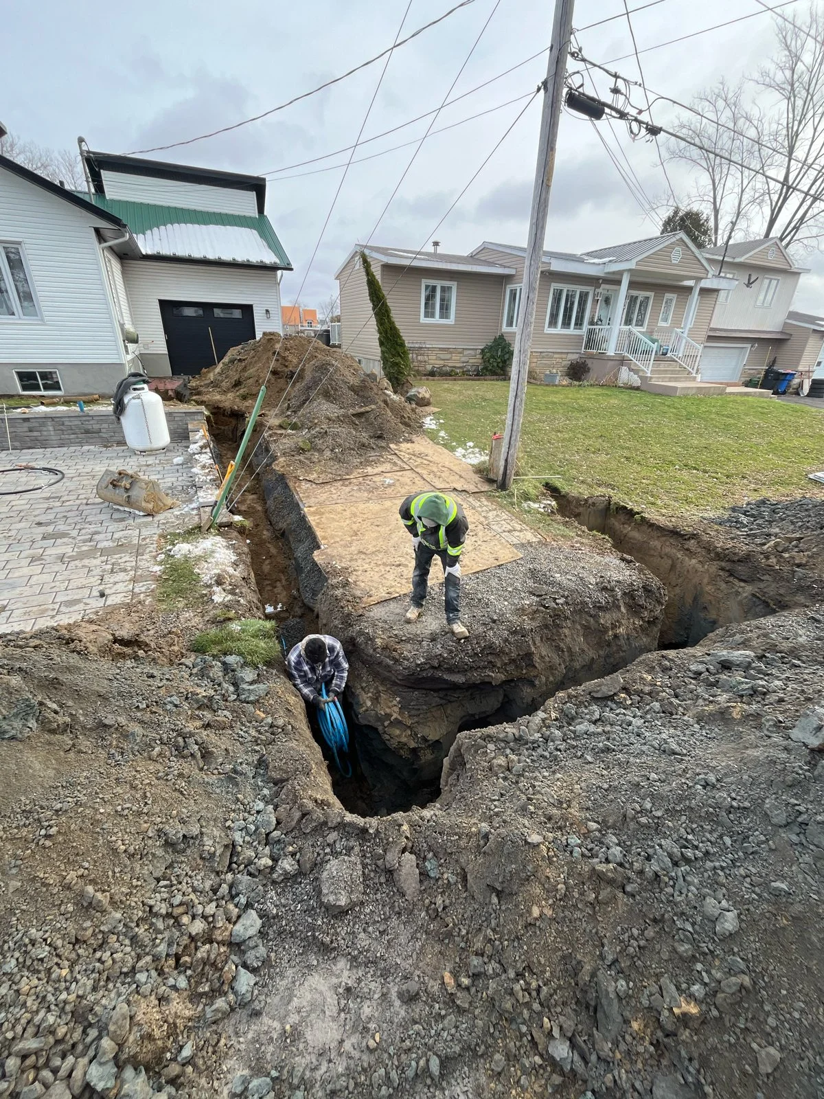 Excavation et remplacement de l’entrée d’eau réalisés en collaboration avec un plombier certifié, afin d’assurer une alimentation fiable, sécuritaire et conforme entre le réseau municipal et le bâtiment.