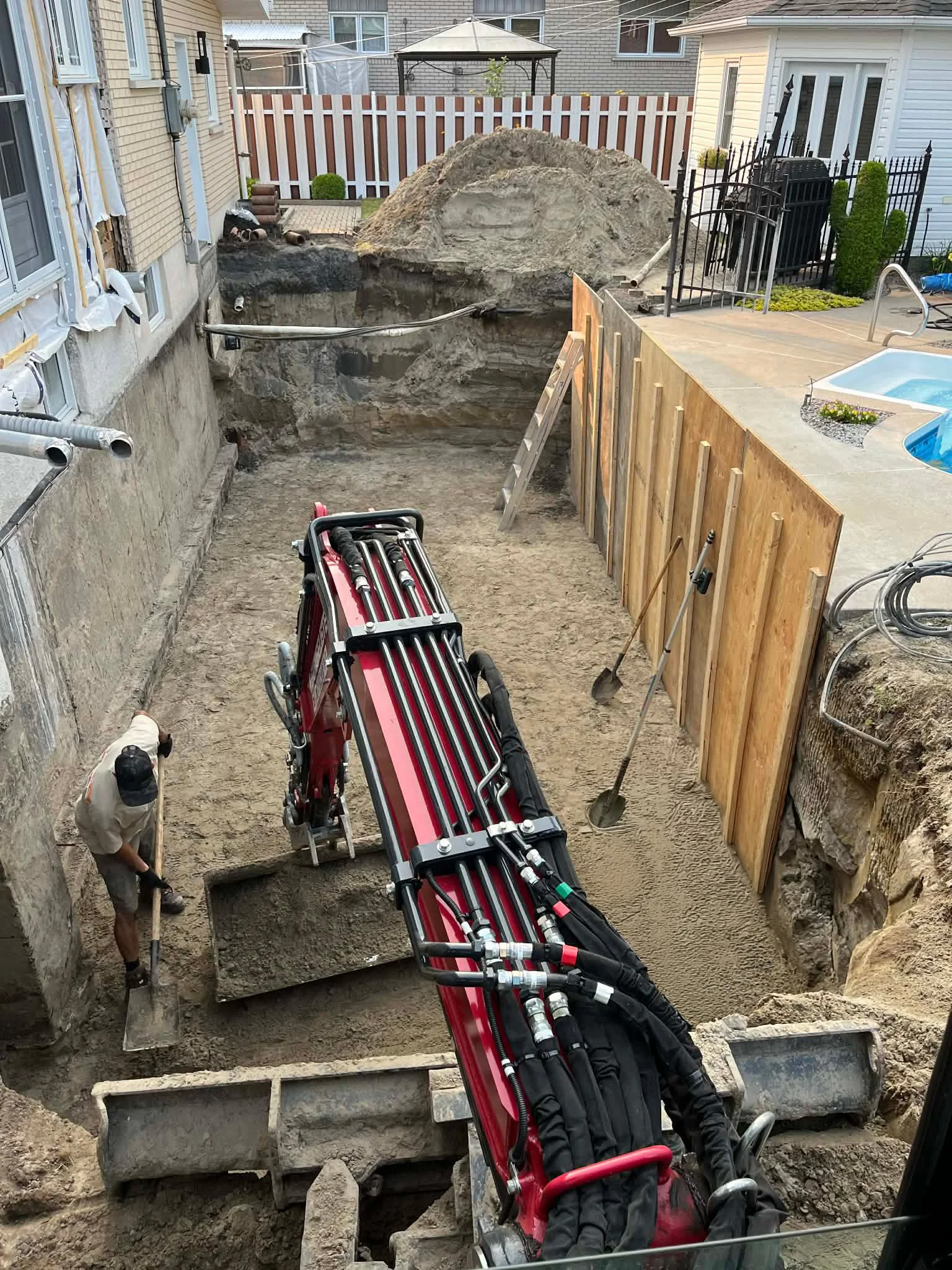 Installation ou remplacement de drains français afin de diriger efficacement l’eau loin de la fondation et prévenir les infiltrations et l’accumulation d’humidité.